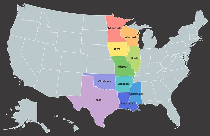 Arkansas、Illinois、Iowa、Louisiana、Minnesota、Mississippi、Missouri、Oklahoma、Texas、Wisconsin