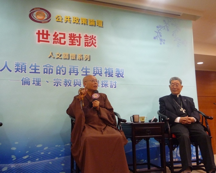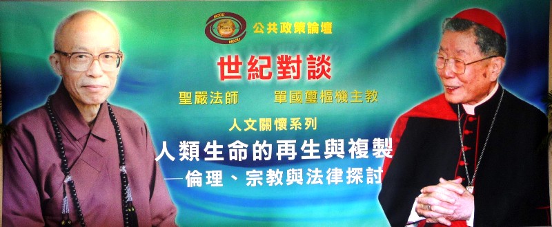IAE國際學士院參與共融國立政治大學建校80週年於公企中心舉辦公共政策論壇--人文關懷系列人類生命的再生與複製,單國璽是第一位以台灣教區主教身份獲教宗冊封為樞機主教者與聖嚴法師是漢傳佛教第一位赴日攻讀博士並順利完成博士學位出家比丘之世紀對談。開幕式由政大吳思華校長主持,來賓教育部社教司朱楠賢司長致詞〈民國97年6月14日〉