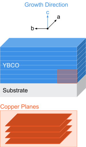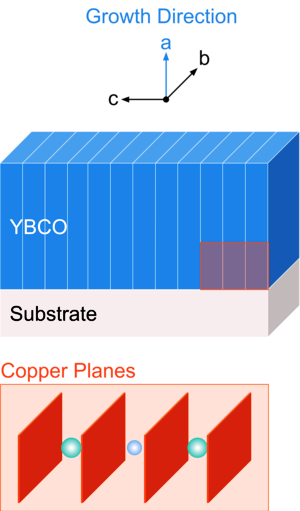 其次,我們如何創造材料?我們通常使用薄膜外延,這是通過在晶體襯底頂部沉積材料層來生長薄膜的過程。當我們提到 a 軸與 c 軸材料時,我們實際上是指外延生長相對於襯底的方向。如果使用 a、b 和 c 軸定義三維晶格,則 a 軸生長將使 a 軸垂直於襯底取向,而 c 軸生長將具有垂直於襯底取向的 c 軸. YBCO 包含的銅原子平面很好地說明了這種差異: