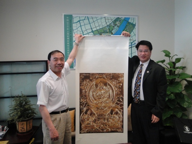 IAE國際學士院 陳俊吉校務長院士典藏 唐朝文成公主以來全球唯一國家寶藏﹝National Art Treasures Of Spirit﹞漢藏蒙滿文化金銅雕--佛陀導師大智文殊化身 格魯派創始人宗喀巴﹝ Tsong Khaha﹞師徒三尊與黃財神(Yellow Jambala) 經過中國國家最高美術機構(中國美術學院)審查通過列入2010年上海世博藝術。上海世博局丁局長代表世博局接受陳俊吉院士 捐贈跨世紀代表14億人口漢藏文化國家御製3D立體金唐卡銅雕-為漢藏蒙滿精神文化融合代表。 2010.06.16 於上海世博局局長辦公中心 中華藝術網攝
