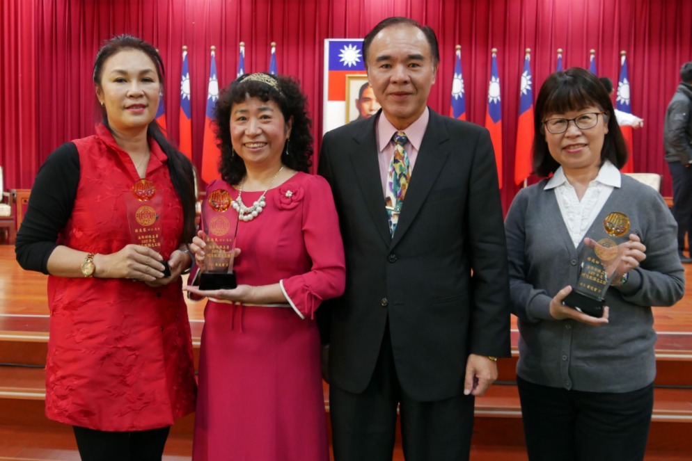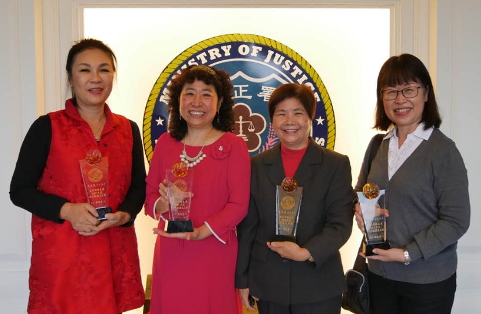 由左到右為獲獎績優教誨志工:高雄楊薇如牧師、台中萬淑民姊妹、彰化陳寶蓮傳道與台北孫長蓉姊妹