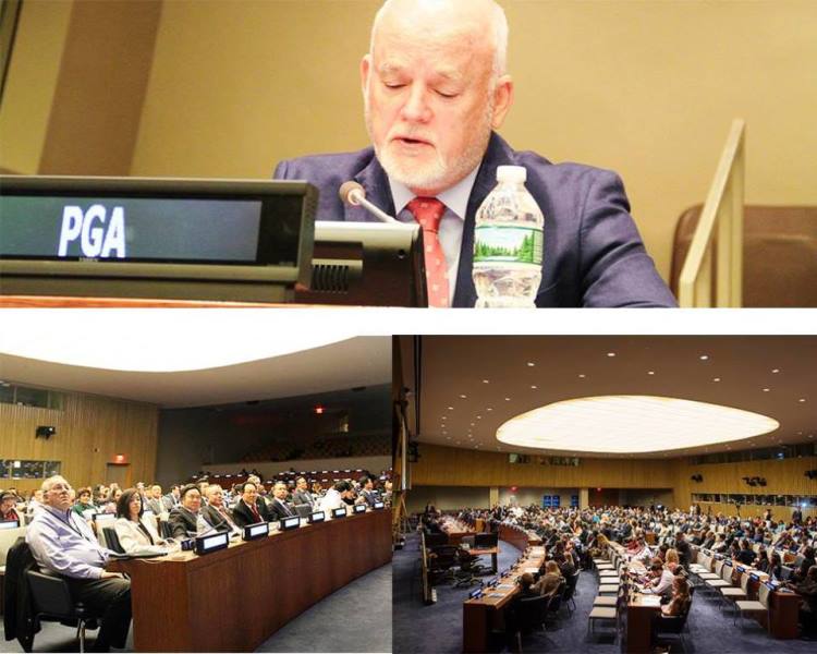 聯合國NGO委員會主席Bruce Knotts先生主持宣佈大會開始,現任71屆聯大主席Peter Thomson先生到會祝賀並致辭