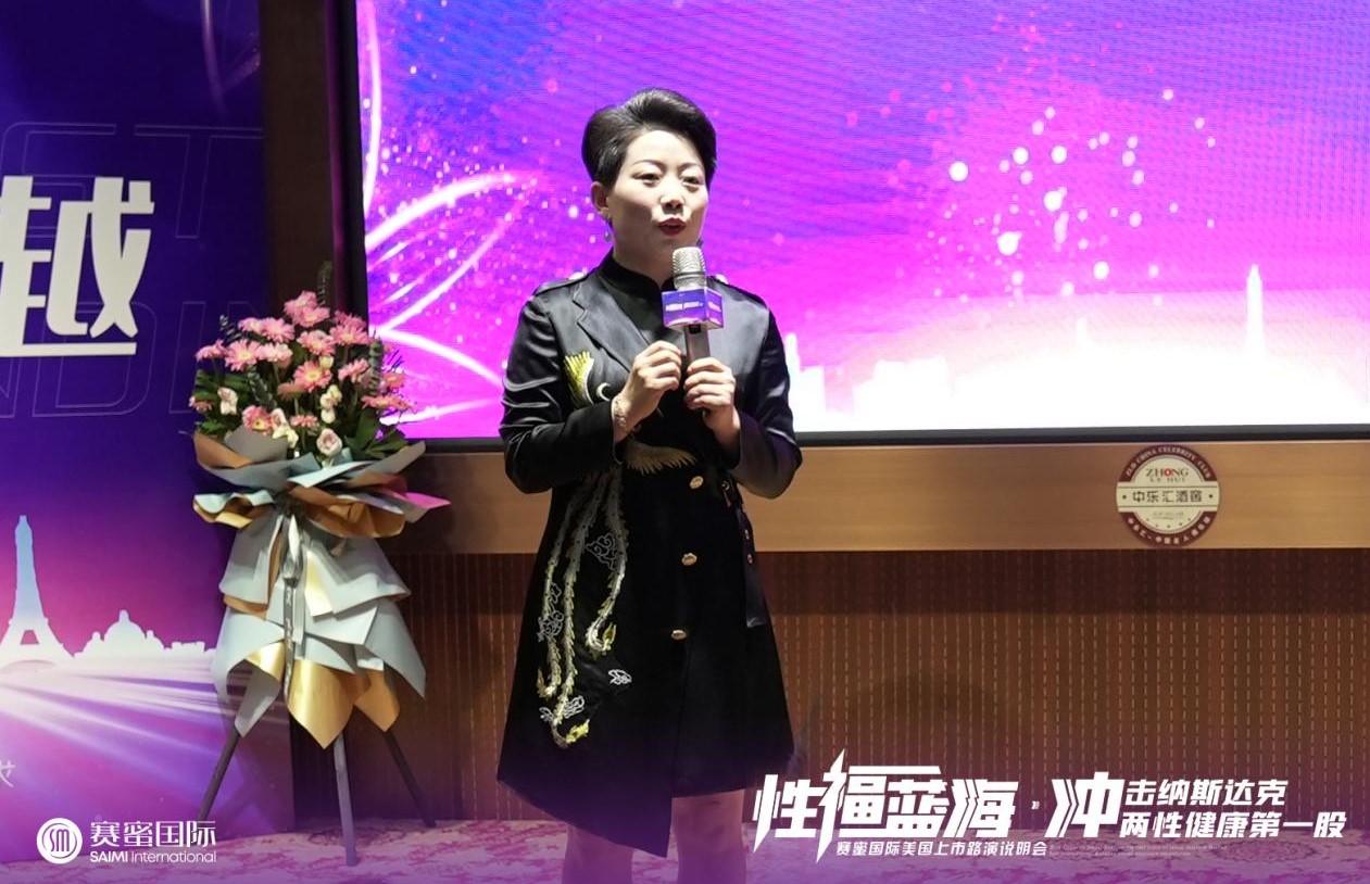 會上,賽蜜國際董事長李艾穎結合大資料對兩性健康產業的歷史背景和發展前景做了深度的分析,詳細介紹賽蜜的商業模式、核心產品、團隊規模、競爭環境以及當前的發展狀況,並結合產業發展趨勢,對賽蜜的未來發展規劃進行了全面解讀,讓現場的投資人夥伴對賽蜜國際有了深入的瞭解。