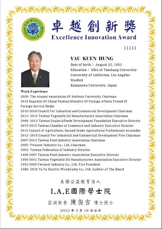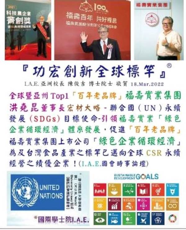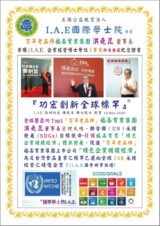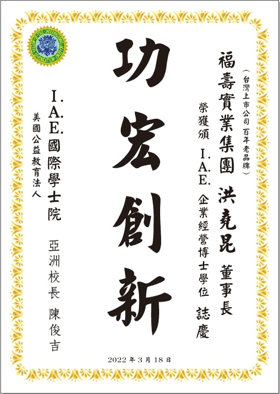 恭賀 全球Top1%台灣上市公司福壽集團 洪堯昆董事長榮獲I.A.E企業經營博士學位及卓越創新獎 全球之星 日期:2022/03/22 IAE 「百年老品牌」1990年台灣掛牌上市公司福壽集團 洪堯昆董事長榮獲「I.A.E國際學士院企業經營博士學位」及「功宏創新 全球標杆」賀匾。 恭賀 全球Top1%『百年老品牌』台灣上市公司福壽集團 洪堯昆董事長榮獲I.A.E「企業經營博士學位」及「卓越創新獎」. 下一篇:內政部警政署前副署長 蔡俊章博士. IAE全球產官學研教 現代藝術美學召集人 聯合國(W.U.U)IAE產學研Top 1%產學研碩博教授審議申請
