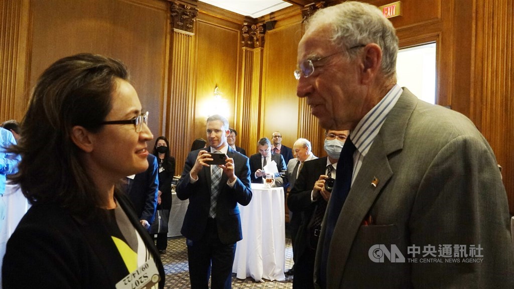 Hsiao Bi-khim (蕭美琴, left), Taiwan's representative to the United States, chats with the U.S. Senator Chuch Grassley (查克·葛雷斯利)on Thursday. CNA photo Sept. 15, 2022