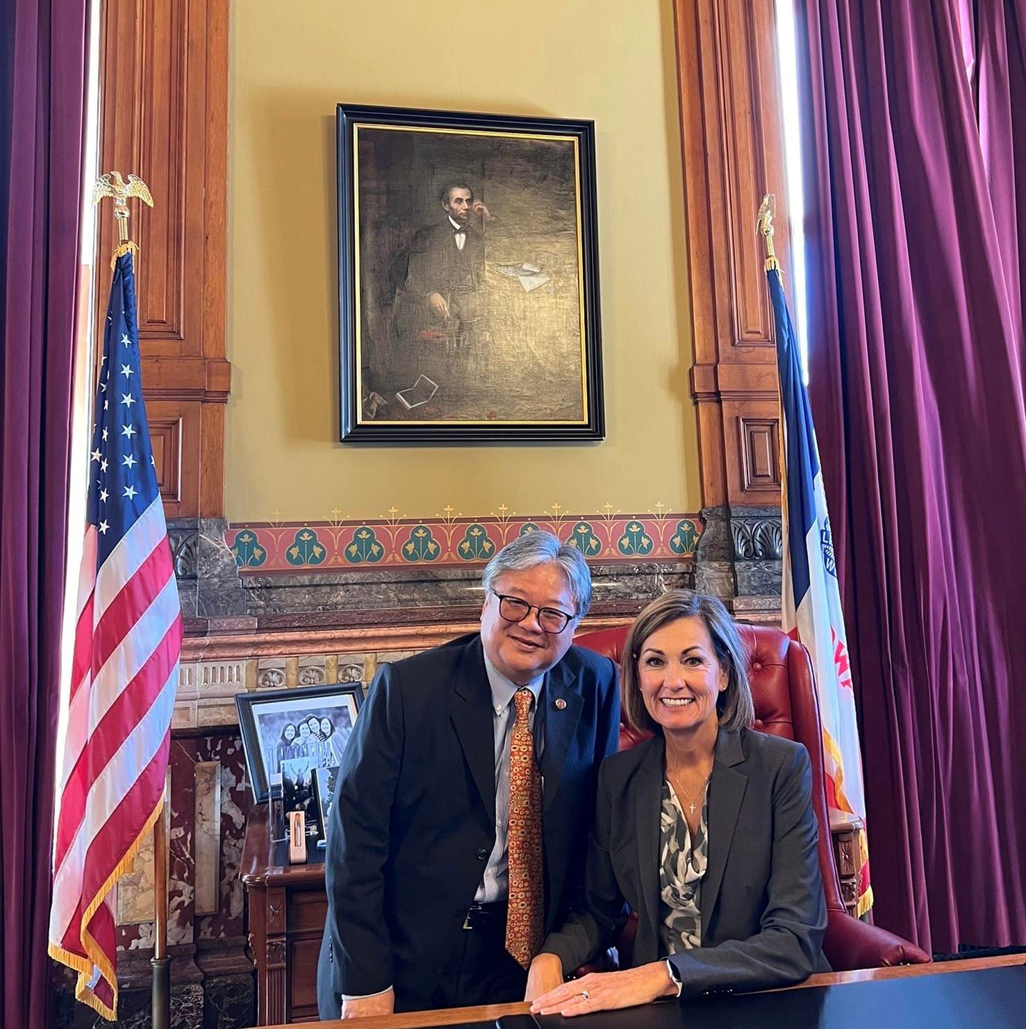 愛荷華州州長 金雷諾茲 (Kimberly Kay Reynolds) 與IAE國際學士院傑出院友 Dr.洪堯昆博士董事長合影