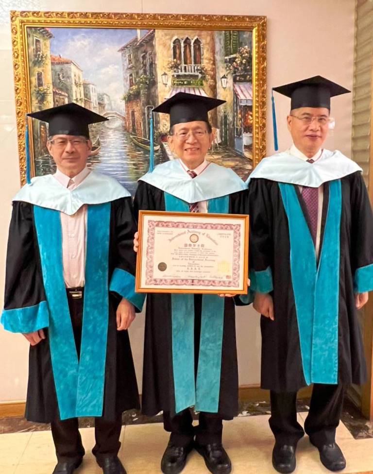上市公司 中國砂輪企業 「全球Top1 再生晶圓」 白文亮副董事長(中) 榮獲頒 聯合國 W.U.U 350年傳承IAE美國國際學士院「企業經營管理教授」由真理大學陳奇銘校長(左)及 IAE美國國際學士院 亞洲總部陳校長(右)共同榮頒見證與12萬分祝賀 2023.04.06 (↑詳細內容 敬請點入)