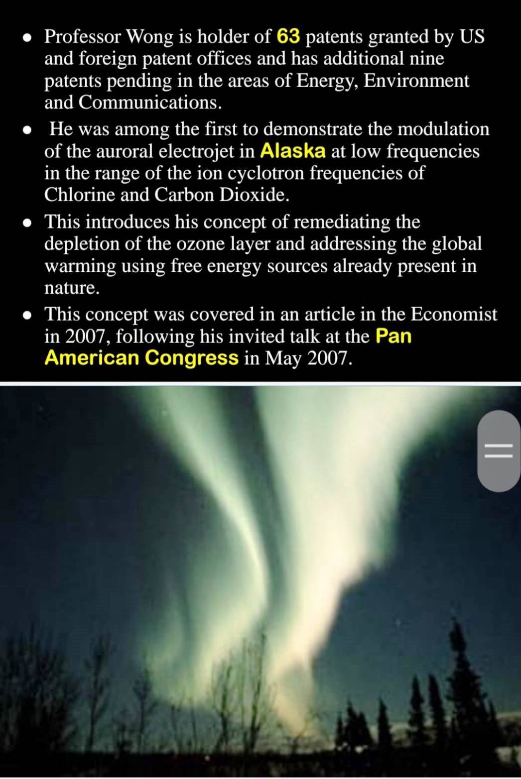 這介紹了他的概念,即修復臭氧層的消耗,並使用自然界中已經存在的自由能源來解決全球變暖問題。 。