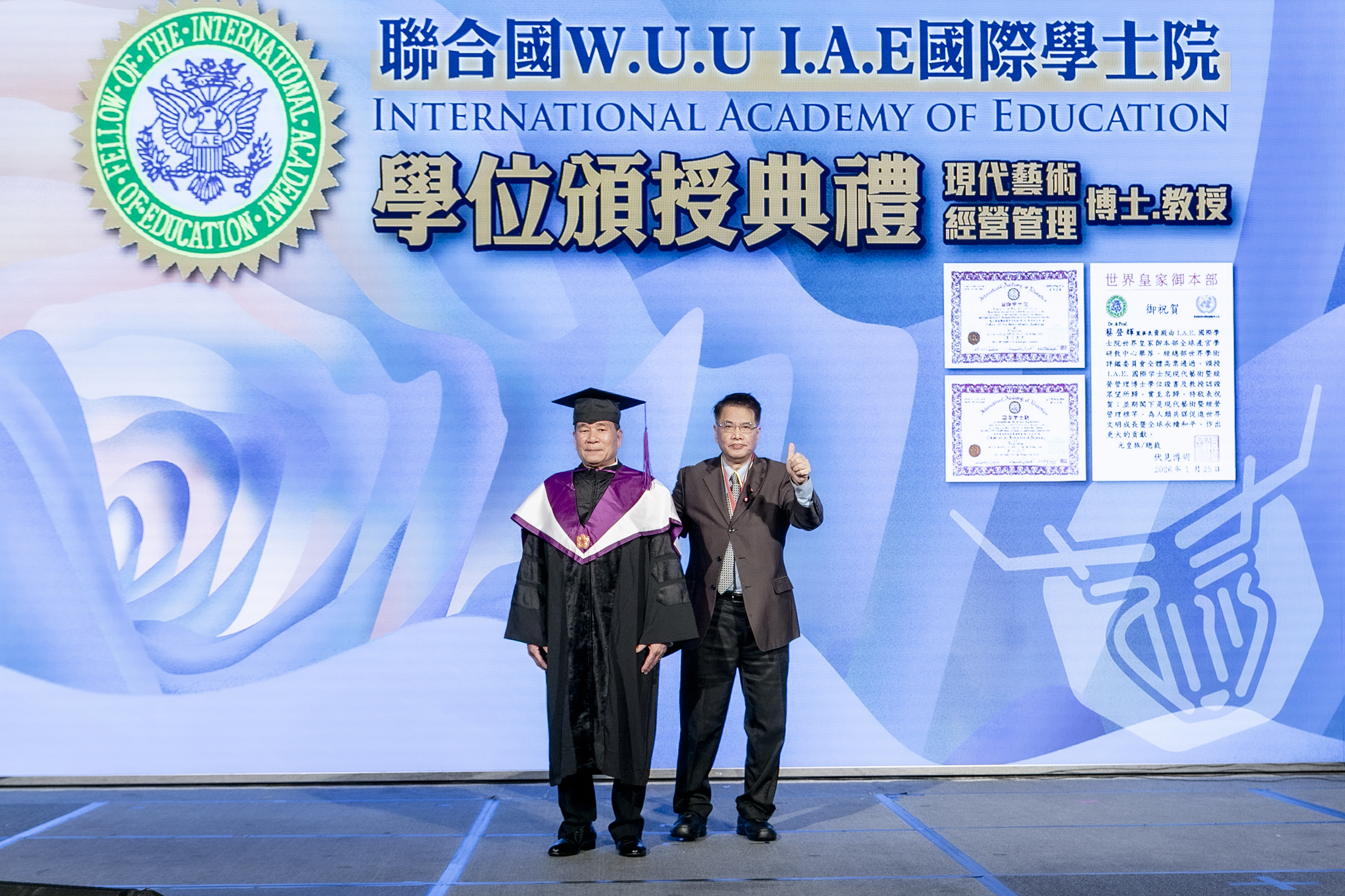 聯合國(W.U.U )IAE國際學士院「審議、評鑒全球產官學研政教之高端人才或 Top1 領導人,並授予碩博士學位或教授資格」