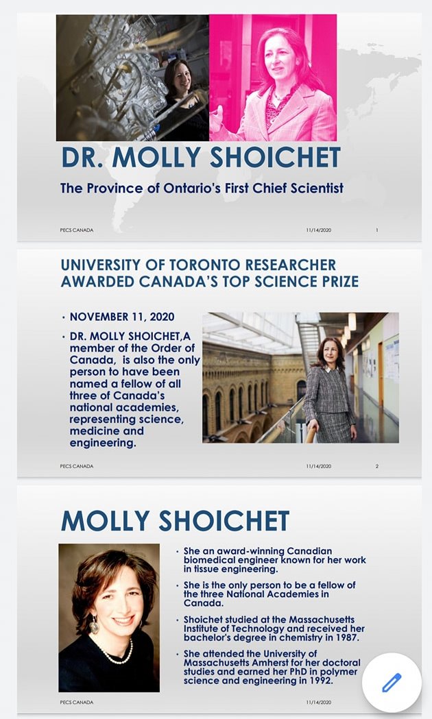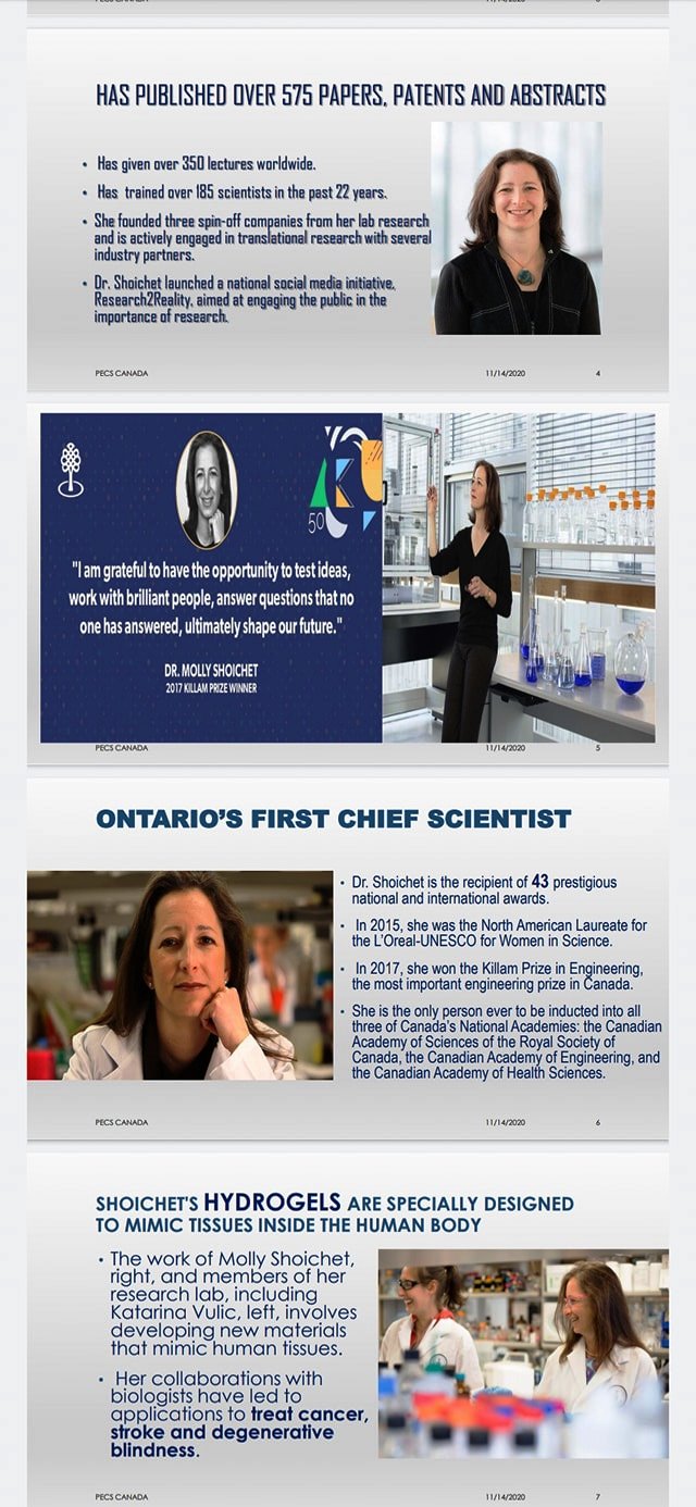 Shoichet博士是一名生物醫學工程師,以從事組織工程工作而聞名,是加拿大三所國家科學院院士中唯一的人。在2019年,她當選為英國皇家學會會員。 维基百科(英文)