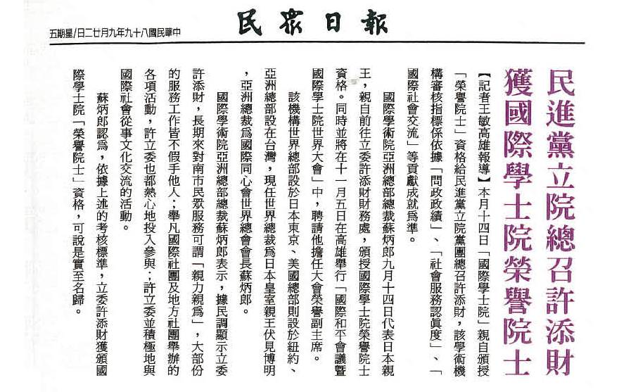 IAE國際學士院榮譽院士(1990年)